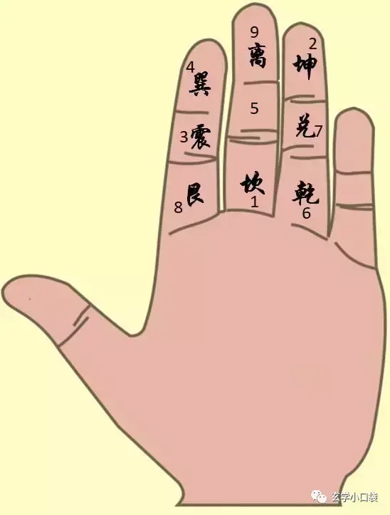 最常见的八卦排位分为:先天八卦、后天八卦、实用八卦三种。上图为后天八卦。这个掌诀中离是正南,坎为正北,震为正东,兑为正西。口诀里说的坤方即是后天八卦的坤位,在西南方。(断卦时的方位是相对于求测者所在位置,或者求测者家所在位置而言的方位。例如对于东北人来说,北京在西南坤方,对于重庆人来说,北京在东北艮方。)在易占应用中,只要以卦为代号提及方位,一般说的都是后天八卦方位,谨记!