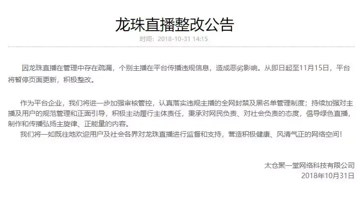 就在11月3日IG夺冠前三天,龙珠直播官方发布了一条整改公告:因龙珠直播在管理中存在疏漏,个别主播在平台传播违规信息,造成恶劣影响。从10月31日起至11月15日,平台将暂停页面更新,积极整改。