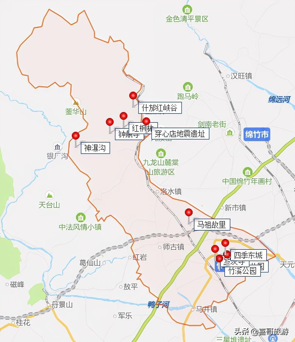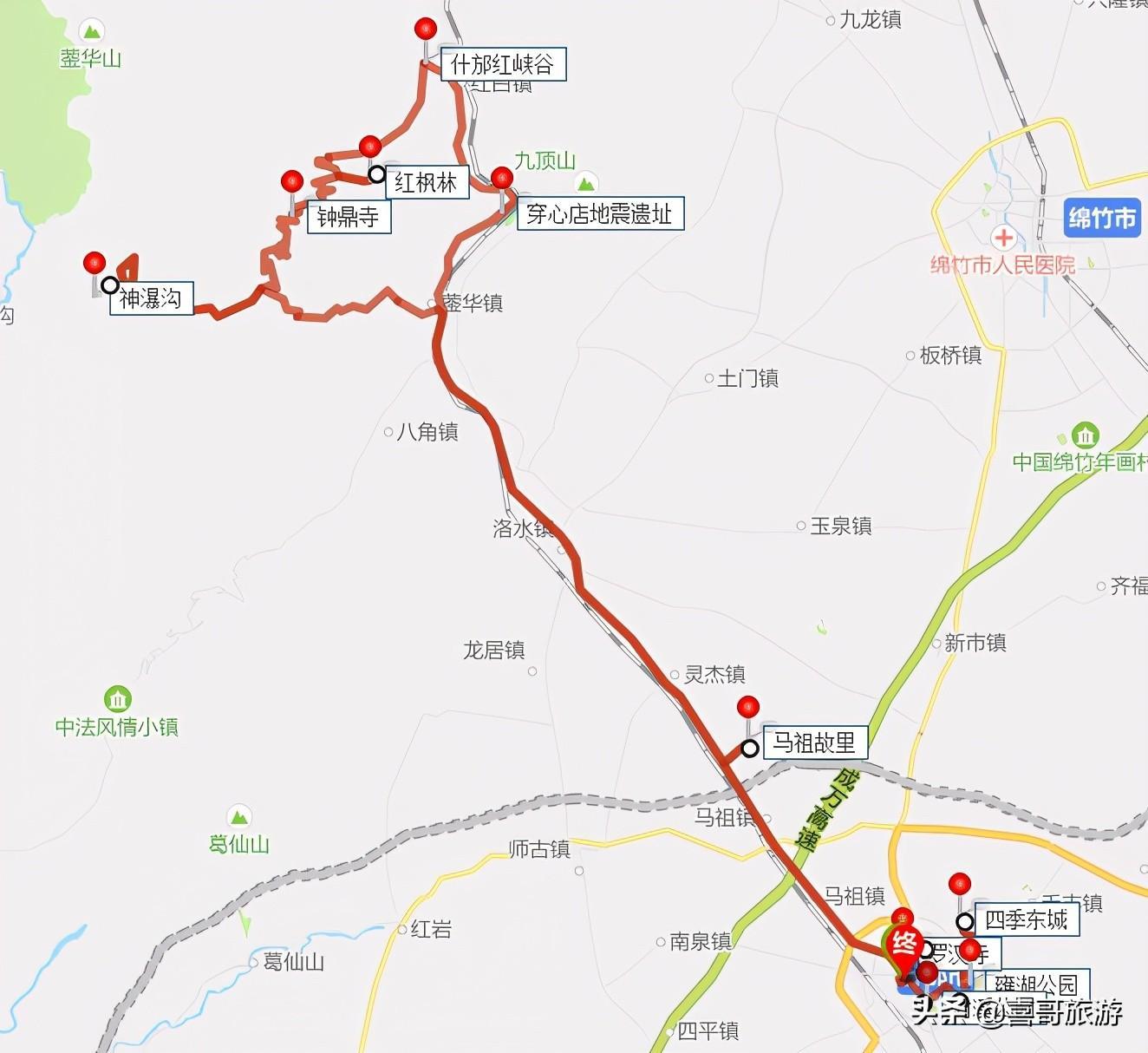 3、一次性自驾游玩四川什邡市以上值得游玩的景点,推荐行程路线:四川什邡市-竹溪公园-雍湖公园-四季东城-罗汉寺-马祖故里-穿心店地震遗址-什邡红峡谷-红枫林-钟鼎寺-神瀑沟-四川什邡市。