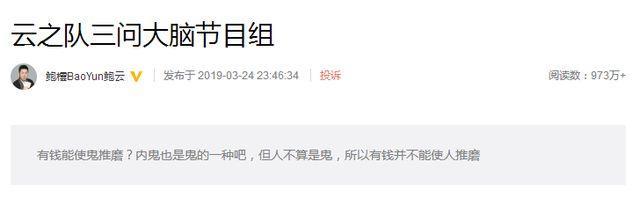 最强大脑第6季于2019年2月15日首播,但是随着节目播出没多久,最强大脑又爆出惊天黑幕!云之队队长鲍橒质疑王易木作弊,并且提出问题指责节目不公平。随着事情的不断发展,鲍橒也被推上了风口浪尖,鲍橒之所以处于风口浪尖的根本原因也不过是其处于对队员的爱护,而发出的那篇《云之队三问大脑节目组》。鲍橒质疑林队王易木作弊一事在网上引起热议,林队队长戚薇在微博直接喊话鲍橒称不要阴阳怪气,含沙射影。3月31日,郭采洁发微博表示支持鲍橒。