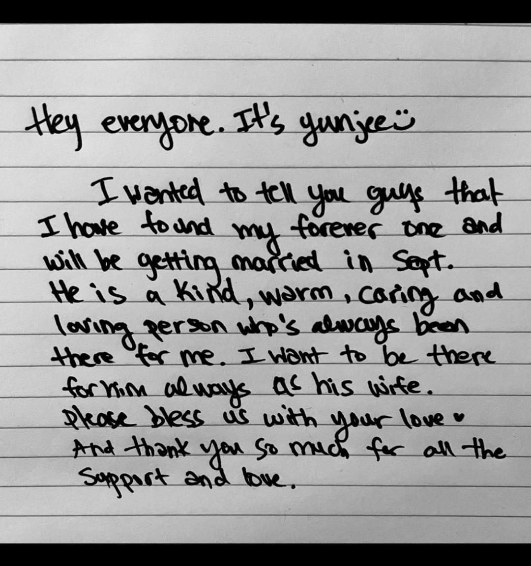 6月28日上午NS允智(本名金允智)在个人ins上公开了手写信和她与未婚夫的合影,并表示自己将于9月结婚。