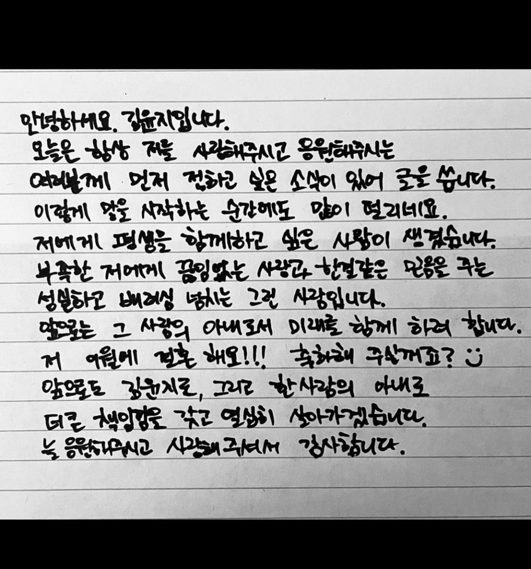 大家好,我是金允智。因为今天有向一直喜爱我、为我应援的大家告知的消息,所以写下了这段文字。这么一说我就开始紧张了,我遇到了一位想要一辈子在一起的人。他是一位对有很多不足之处的我给予了无限关爱和信任的诚实贴心的人。未来我要作为他的妻子和他一起生活,我们将在9月结婚!大家会祝贺我的吧?以后我也会作为金允智以及一个人的妻子,带着更大的责任感努力地生活。感谢大家一直支持和喜爱我。