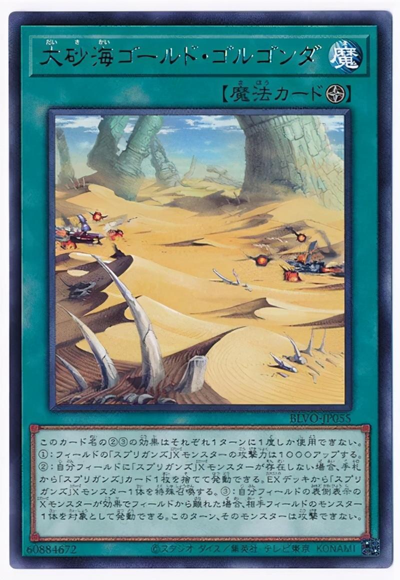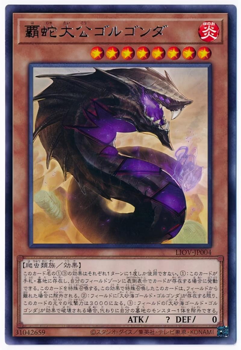 最后是“霸蛇大公.戈尔工达”,卡片形象为一黑紫色的大蛇,攻击力为0,守备力0,怪兽等级为8星,是炎属性的爬虫族怪兽,效果为(这个卡名的①③的效果1回合各能使用1次。 ①:这张卡在手卡·墓地存在,自己的场地区域有表侧表示卡存在的场合才能发动。这张卡特殊召唤。这个效果特殊召唤的这张卡从场上离开的场合除外。 ②:只要场上有「大沙海.黄金戈尔康达」存在,这张卡的原本攻击力变成3000。 ③:场上的「大沙海.黄金戈尔康达」被效果破坏的场合,可以作为代替把自己墓地1只怪兽除外。)