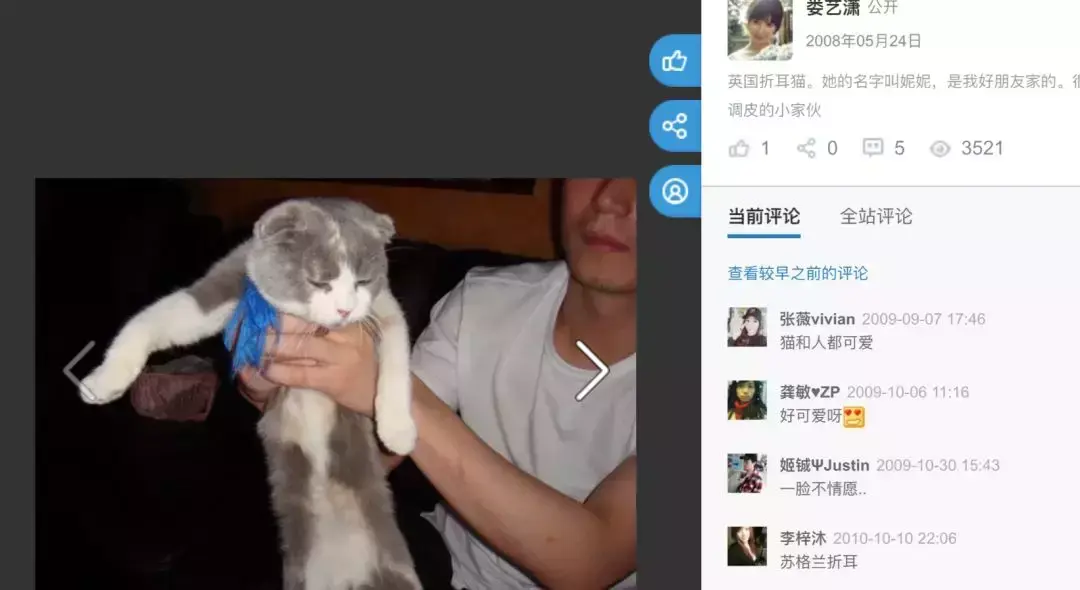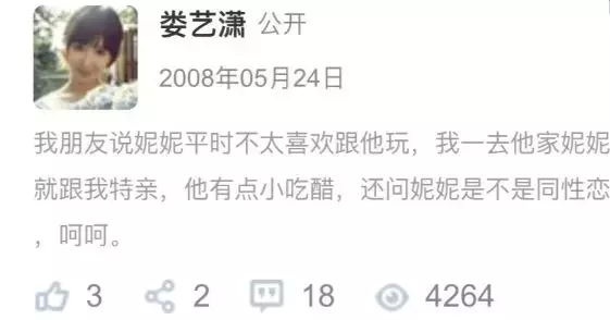 08年的时候,娄艺潇还是学生,在她的人人网主页上,一直会发一个男生跟一只猫。