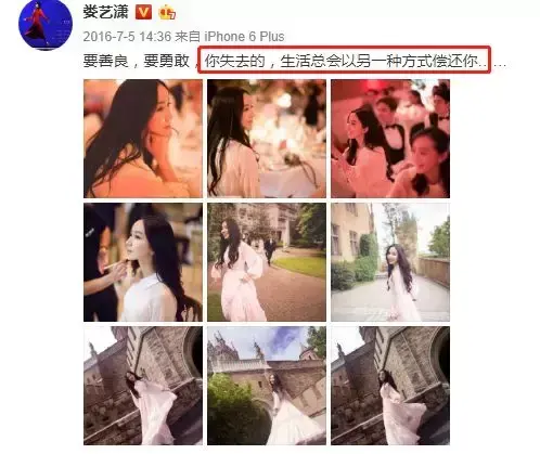 过了一个小时左右,娄艺潇也发了一条微博,“要善良,要勇敢,你失去的,生活总会以另一种方式偿还你…… ”