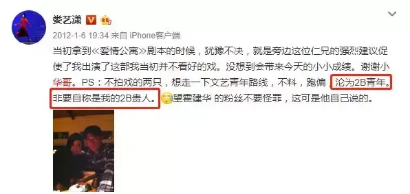 因为此事,霍建华还自称是娄艺潇的“2B贵人”。