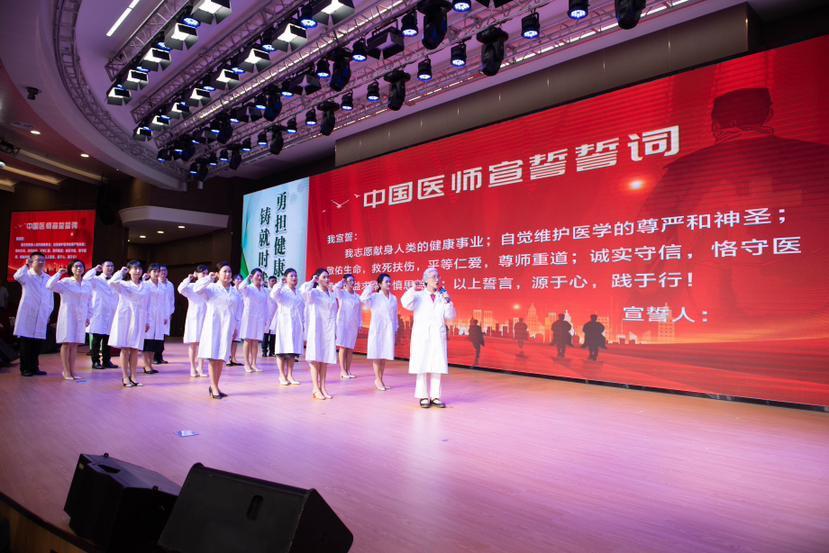 全国先进工作者、全国医药卫生系统先进个人、全国道德模范、第七届中国医师奖获得者王争艳带领全体青年医师宣誓并领誓:“敬佑生命,救死扶伤,甘于奉献,大爱无疆。”广大医务工作者在新时代新征程,肩负着推进健康中国建设、保障人民健康的神圣使命。青年是医学的未来,人文是医学的灵魂。
