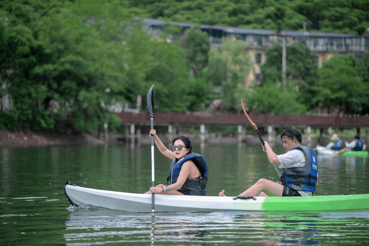 水上运动营地,桨板皮划艇无限畅玩。水陆空清凉体验,可以玩出N种方式。第一次来安吉,星潮绝对是首选。体验丰富、项目种类多、清凉时间长、刺激指数很高。比如桨板和皮划艇,这两项颇受欢迎的夏日水上运动,参与性、趣味性、舒适性都很强。单人单桨单板,达人能玩出酷炫的“水上漂”,对身体协调性、平衡能力要求较高,非常适合年轻男女体验。皮划艇适合双人组合、亲子参与,一起竞速,或是打水战。它需要靠上肢与腰腹发力,前后双桨划水节奏配合。这不,最近王思聪就打卡了安吉星潮营地的皮划艇。
