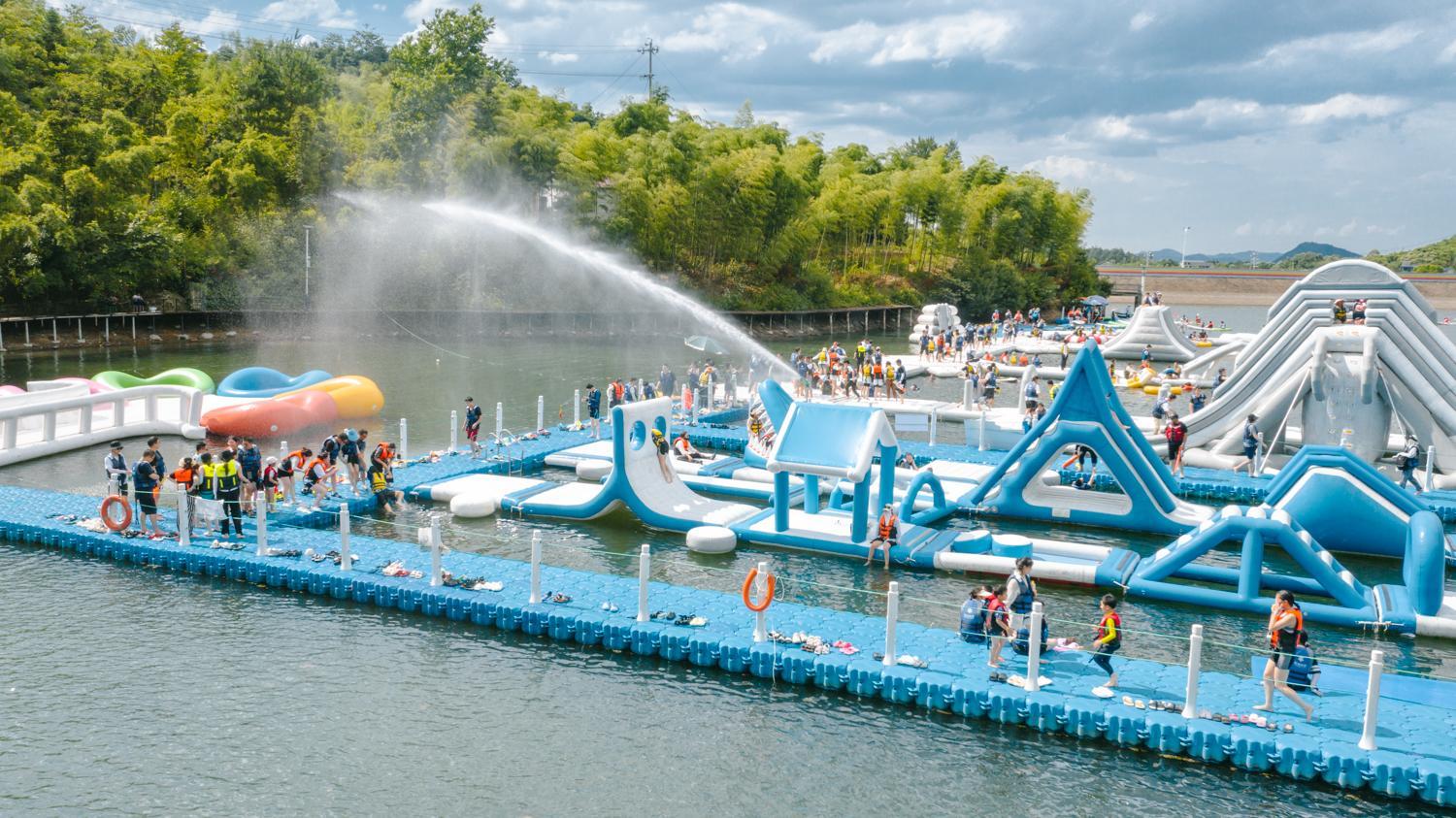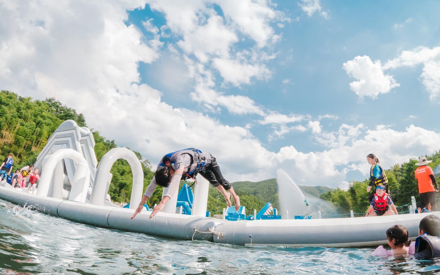 水上冒险岛,全家玩水总动员不二地!夏日烤验,做一回“清凉泳士”。巨大的水上城堡漂浮在狮子石水库,本身极其令人兴奋。航拍视野下,绿水青山,浪花四溅,花式跳水、冒险闯关等场面,也是名副其实的“玩水胜地”。无玩水不夏日。玩水是人的天性,爱冒险是孩子的天性。飘摇不定3米长的独木桥、5米落差的垂直大滑梯、水上跷跷板、弹跳云、魔毯等亲水体验,也是很受游客喜爱,体力脑力双重考验,独具寓教于乐的趣味。