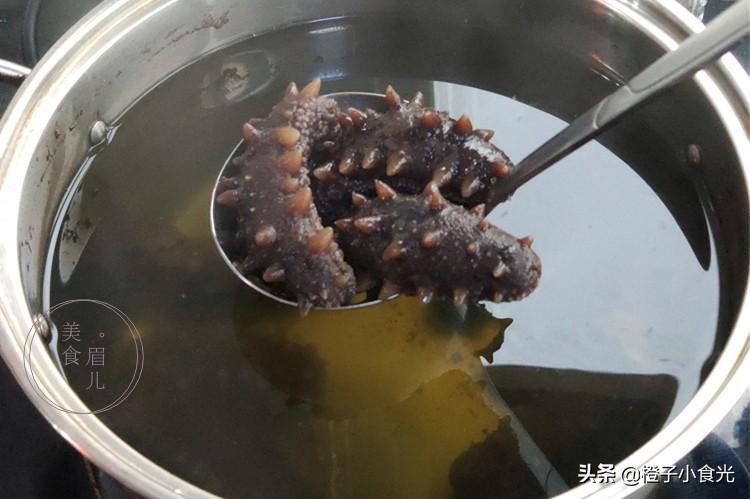 2、煮海参的时间,要根据不同的海参调整,有的海参干一些则需要煮时间长点,总之是先煮再焖,看看是否煮透,不行就二次煮焖,达到用手可轻松掐透海参即可。