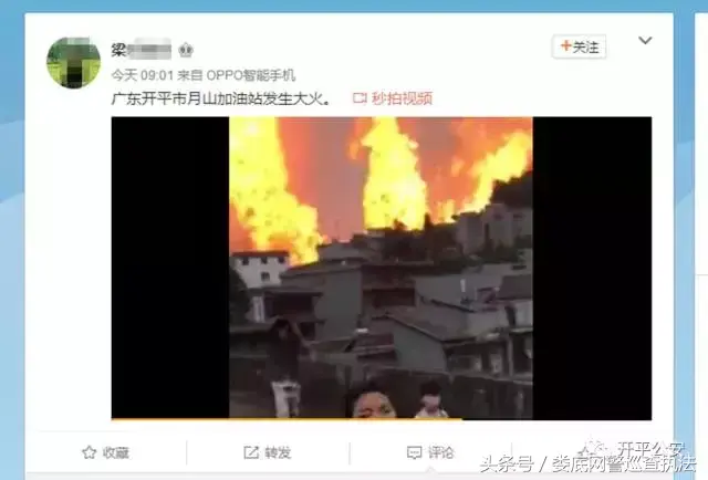 经查实,7月18日上午9时01分,嫌疑人梁某武通过手机下载发生在外省某地燃气管道爆炸火灾的视频,在未核实该视频真实性及发生地事实的情况下,张冠李戴分别用新浪微博用户@某某娱乐和微信用户@某乐,将该视频编造为“广东开平市月山加油站火灾”的虚假事实在信息网络上进行传播,后经不知实情的网民大量转载、转发,造成不良的社会影响和公众的恐慌。