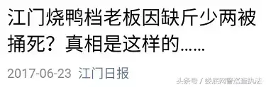 今年6月,朋友圈就疯传“江门康乐市场买烧鸭少了二两,顾客回头发生口角,将老板一刀捅死。”随后,该消息也被警方证实为谣言。经搜寻,记者确认视频案件应为今年5月29日于湛江廉江安铺镇菜市场发生的案件。5月,廉江市公安局将犯罪嫌疑人韩某抓获归案。此前,在肇庆、东莞、茂名等地也有流传,谣言内容大同小异,仅是换了一个地名。