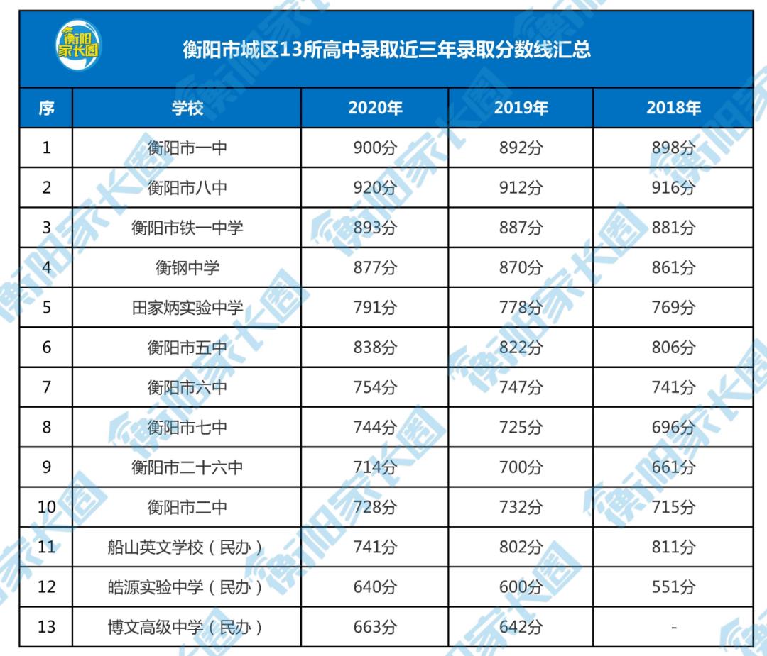 2020年,衡南一中的中考录取分数线为845分,845分这个成绩在市区高于衡阳市五中838分,低于衡钢中学877分达32分之多,以下为衡阳市城区近三年高中录取分数线的汇总: