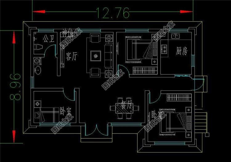 占地面积:12.76m*8.96m,106平方米左右;建筑层高:一层;建筑高度:7.374米(含屋顶);设计功能:一层户型:客厅、厨房、餐厅、卧室x3、卫生间