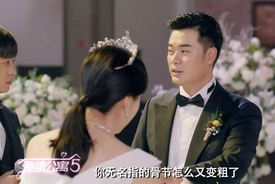 按照导演的脾气,这场婚礼自然不会那么平淡,胡一菲给曾小贤戴戒指,结果对方无名指的指节被门给夹肿了,怎么也戴不上去。
