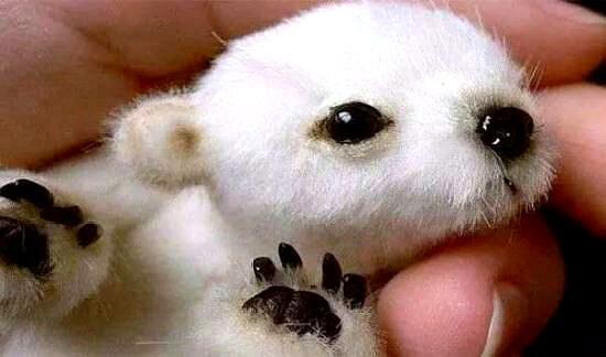 这张可爱的照片中有一只北极熊宝宝,它正瞪大了眼睛看着镜头,那么庞大的北极熊难道宝宝只有手一般大小吗?当然不是的,大家动动脑,想想这张照片就是假的,其实这张照片是一个玩具熊,看起来就像是一只北极熊小宝宝。