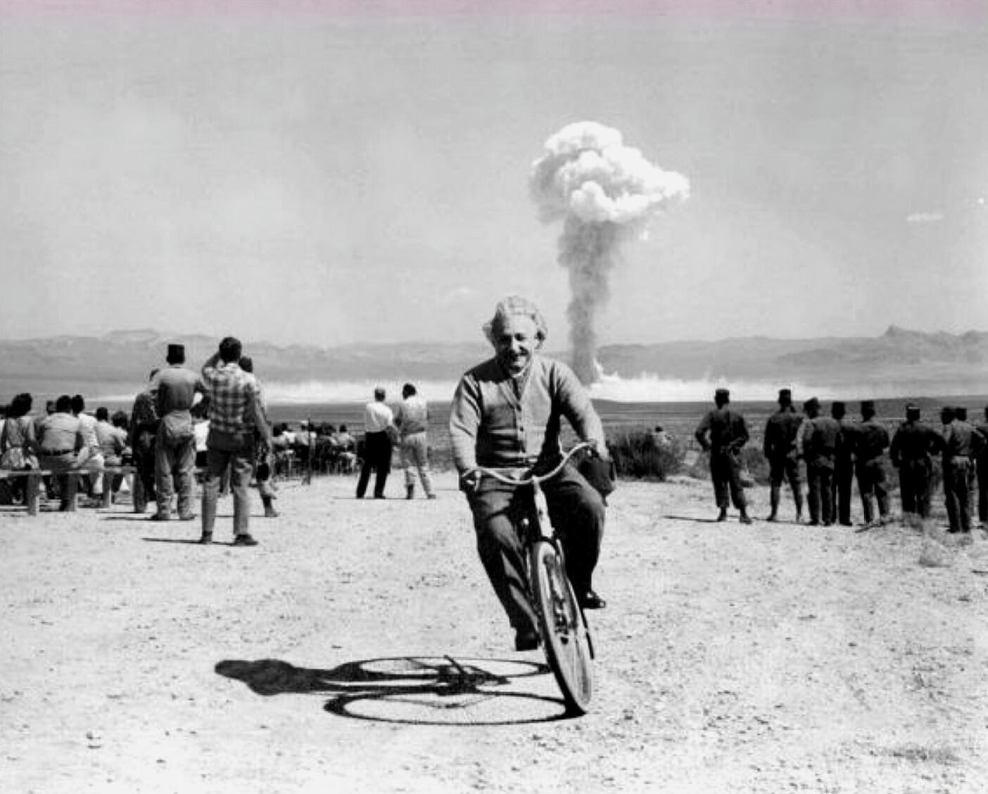 这张爱因斯坦骑着自行车的照片,其实是一张假照片。这张照片是经过后期PS合成的,将爱因斯坦骑车的照片和原子弹试验场的照片结合起来的。