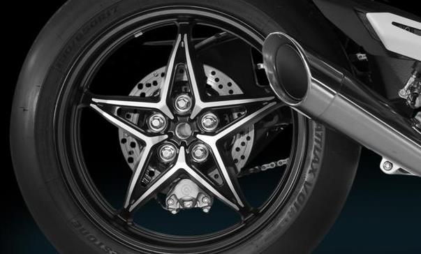 它采用了直通式的尾部排气管,它的排放噪音高达170dB,比专业的MotoGP赛车还吵,搭配五角星形状的后轮圈以及宽大的热熔胎,简直就是谋杀相机和眼球的神器。