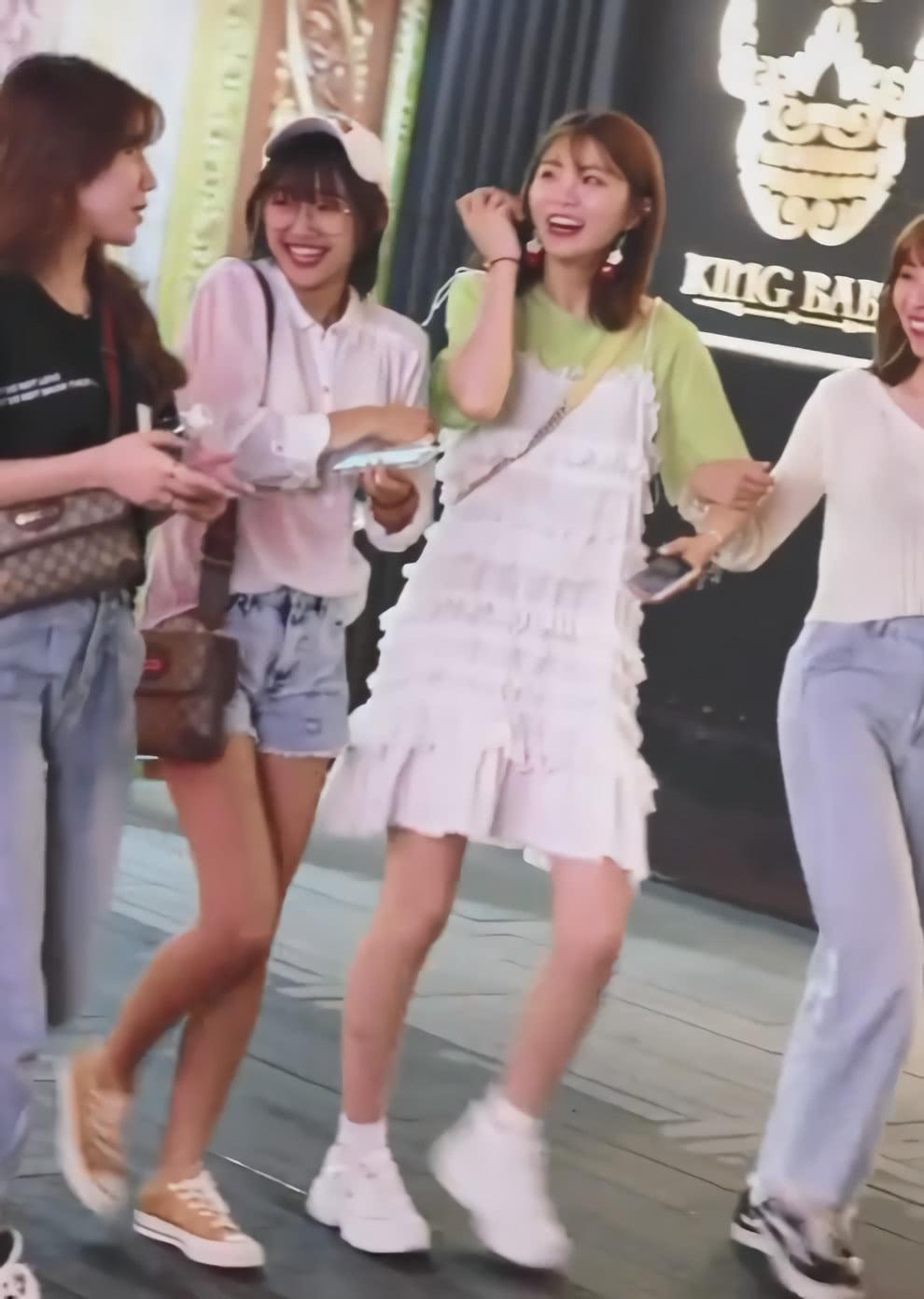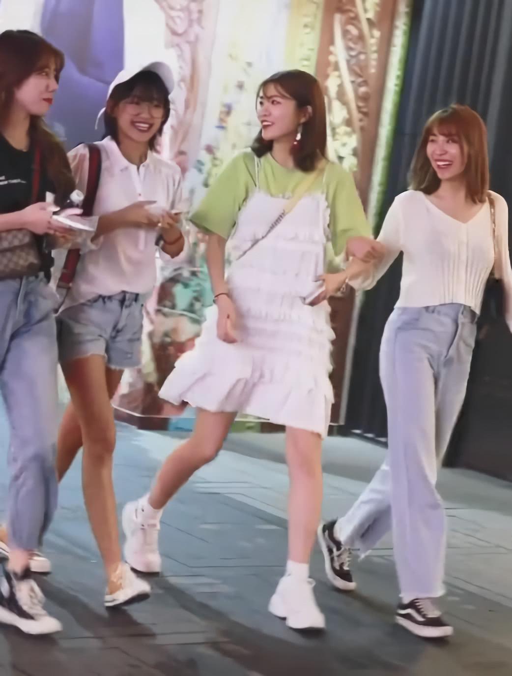 跟代古拉相比,她左手边的闺蜜是四人中比较亮眼的存在了。她穿着一件绿色的T恤,搭配白色的吊带裙,色系的搭配很是清新自然,而裙身上面的褶皱花边带着时尚的气息。脚踩白色的休闲鞋,整体穿搭尽显少女元气。