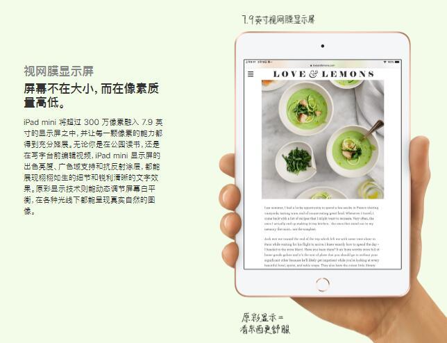 新iPad mini三维尺寸和上一代产品保持一致,长宽高分别为203.2 x 134.8 x 6.1mm,WiFi版重量为300克,蜂窝板重量为308克,依旧搭载7.9英寸全贴合屏幕,分辨率20481536,PPI为326,这个数值是目前所有iPad中最高的 ,同时支持原彩显示和P3广色域,500 尼特亮度。