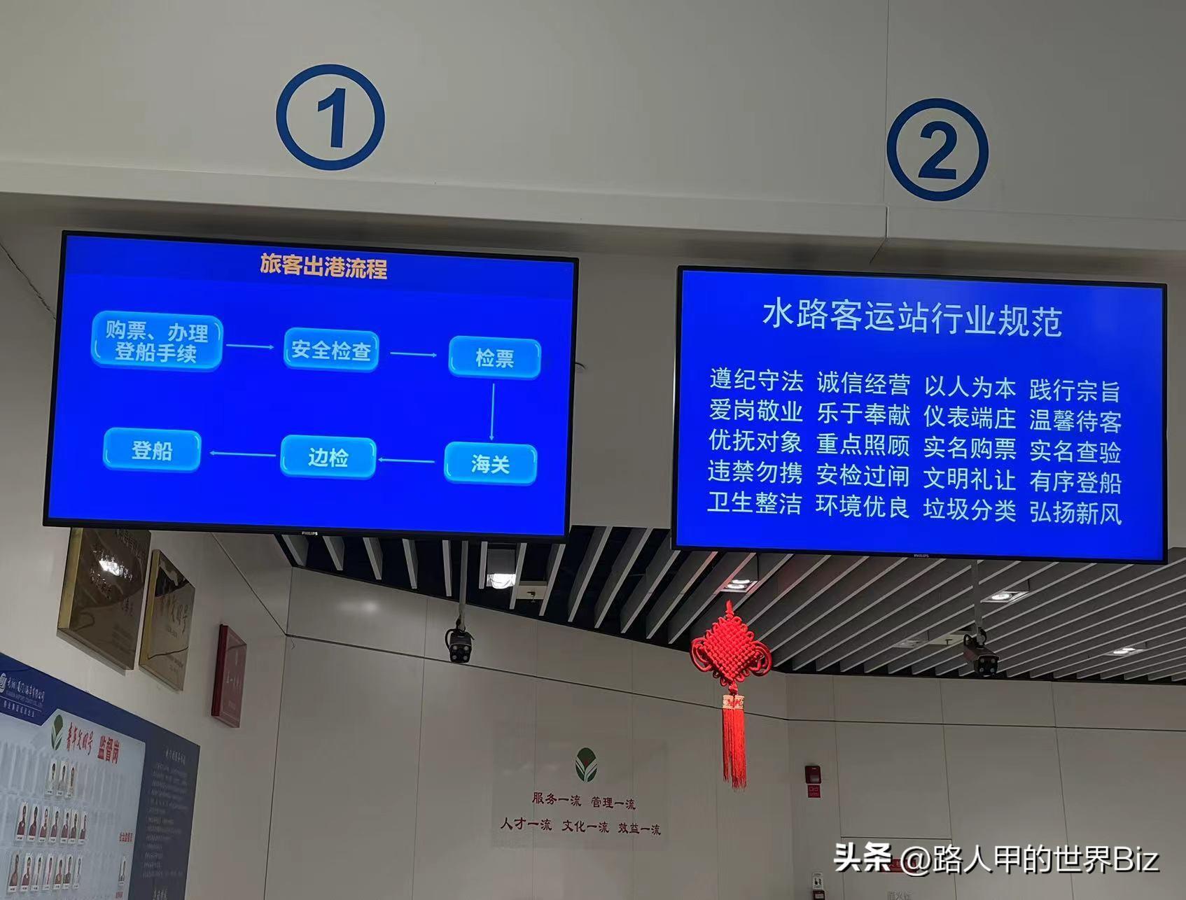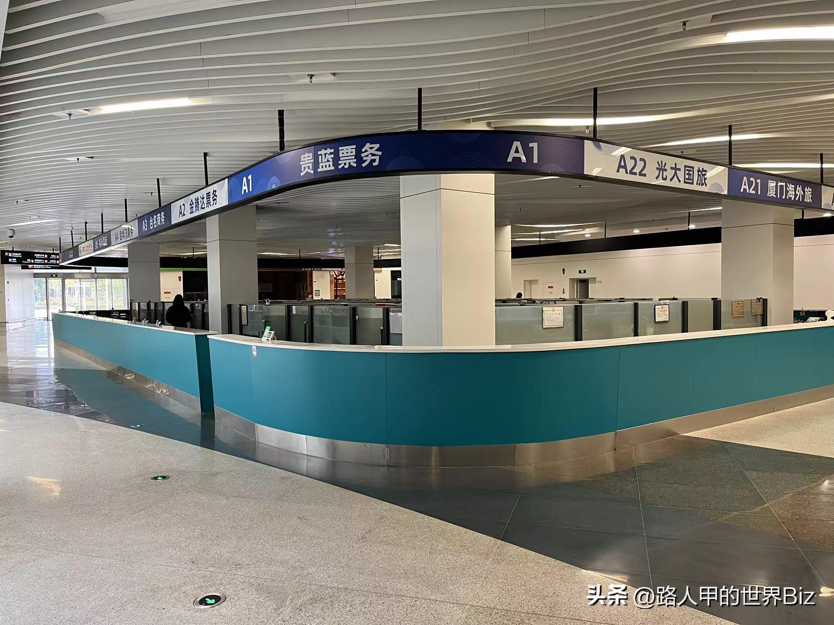 五通客运码头出发厅内部人流很少,各个旅游服务柜台也还没开放。