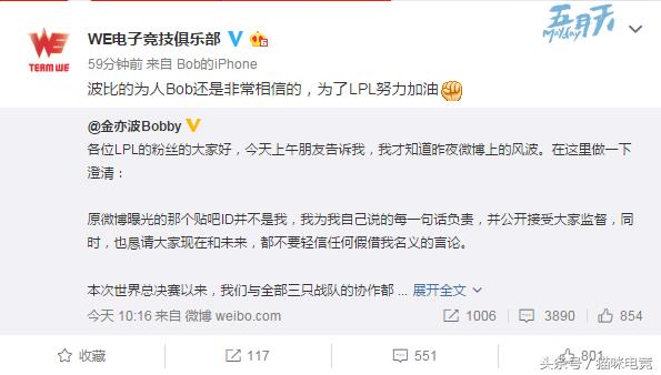 WE创始人发言力挺官方人员波比,并澄清谣言:我们输给TSM是BP出了问题,并不是什么被泄露战术。现在LPL最重要的是团结,请黑子们消停点吧。
