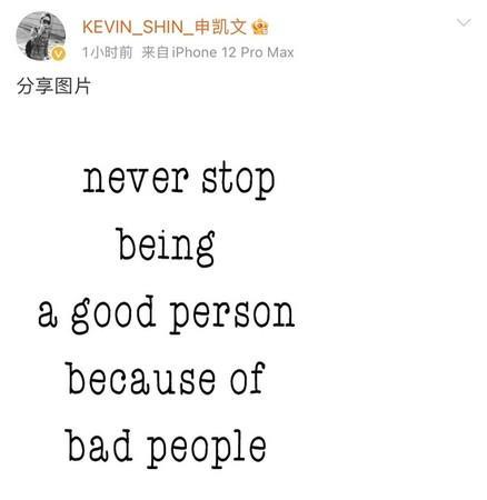 31日吴亦凡被公安证实遭到刑事拘留,申凯文却在隔天发微博写下:「永远不要因为坏人而停止做一个好人。」,Instagram限时动态也更新「在这一刻我只能说:好人总是团结在一起,是有原因的」,也被解读是在针对昔日好友下场的感叹。