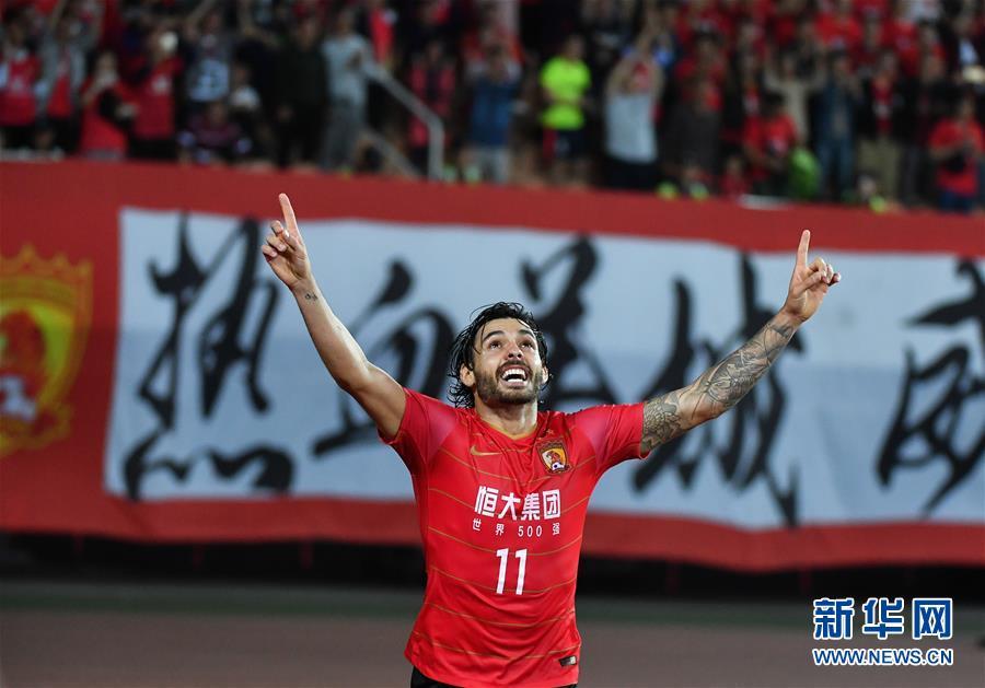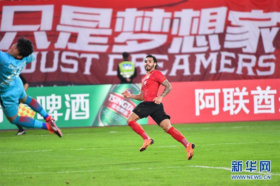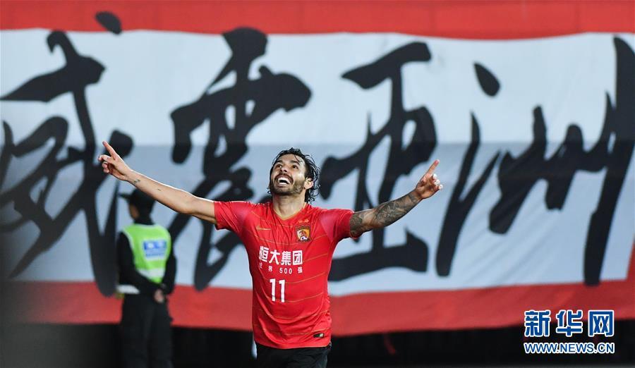 ↑3月6日,广州恒大队球员高拉特在比赛中庆祝进球。新华社记者刘大伟摄