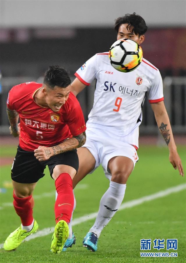 ↑3月6日,广州恒大队球员张琳芃(左)与济州联队球员陈成昱拼抢。新华社记者刘大伟摄
