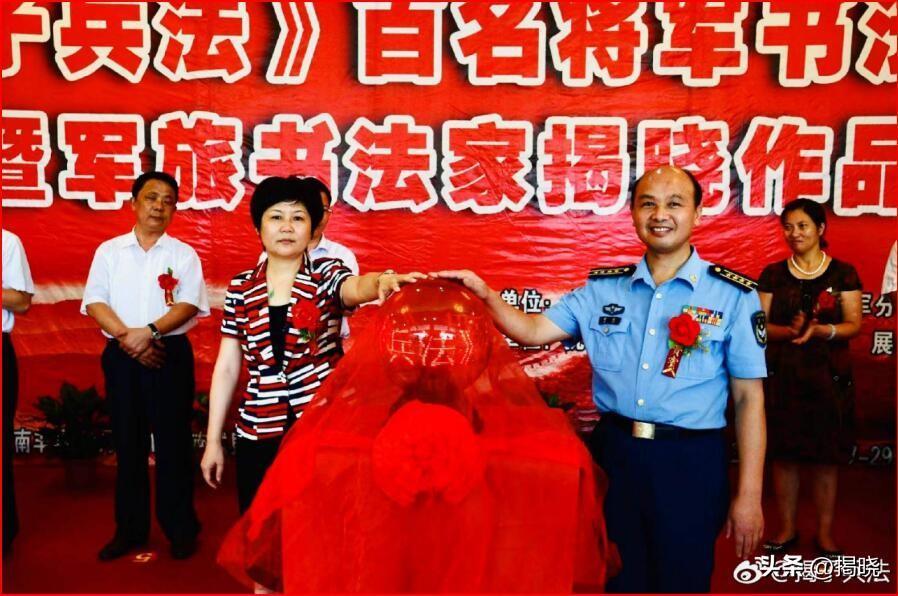 2012年8月23日,“《揭子兵法》百名将军书法抚州巡回展暨军旅书法家揭晓作品汇报展”在抚州市宜黄县隆重开幕,图为抚州市人大常委会副主任兼宜黄县委书记江玉兰与揭晓大校一起在开幕式上共同按下启动球