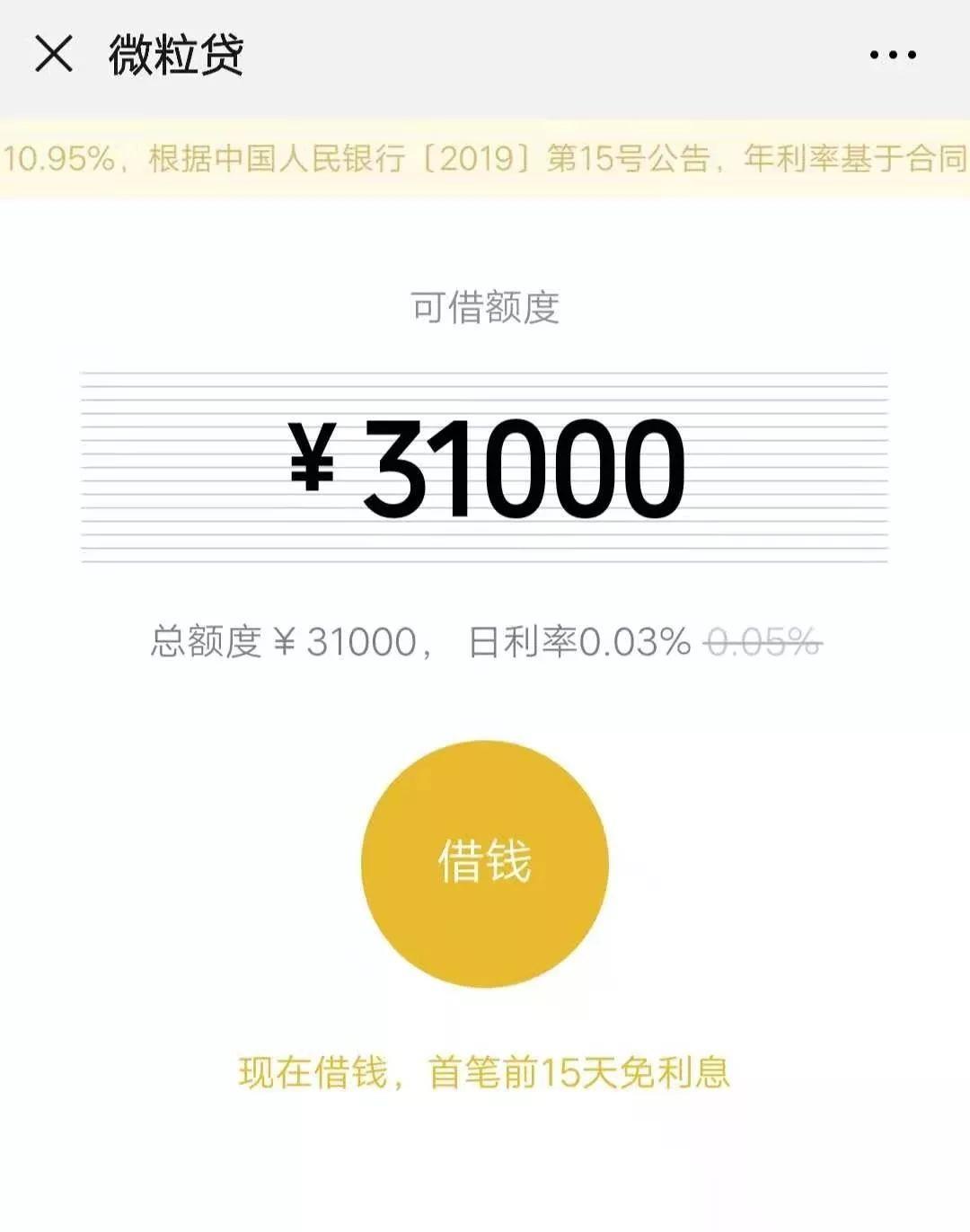 比如说我自己的微粒贷,可借额度是31000元,日利率是0.03%。