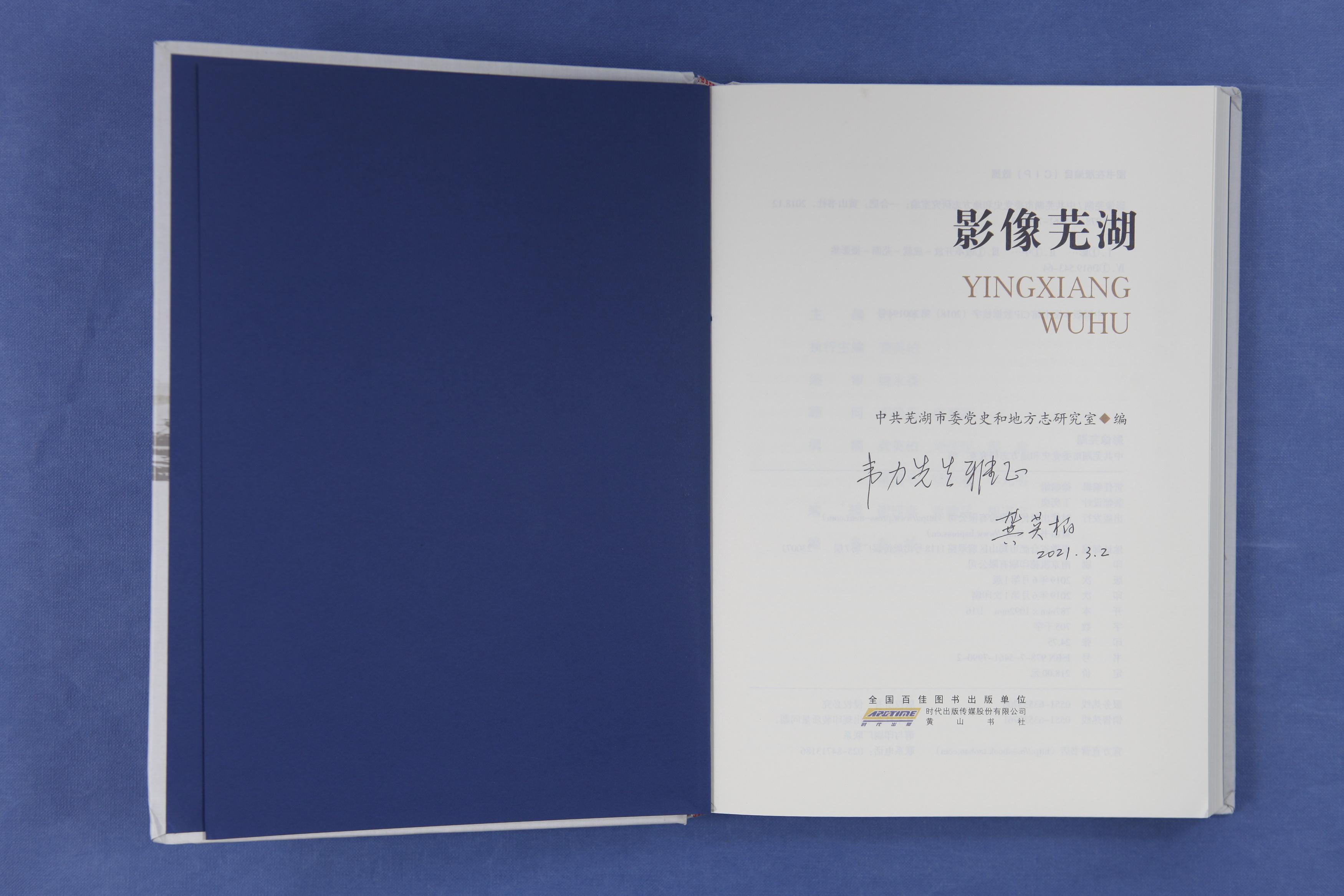 该书为芜湖文献专家许进先生所赠,他在微信中说:“您上次来芜湖,郭青兄贈予《芜湖旧影——甲子流光》;之后又出版了《影像芜湖》。日前与执行主编龚英柏先生偶遇,我让他签名呈上一册供雅正。”