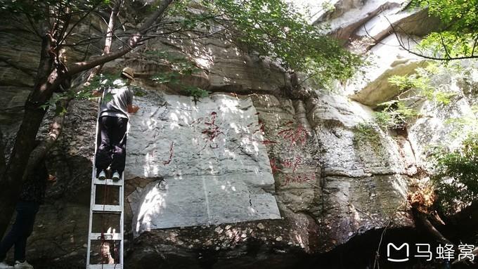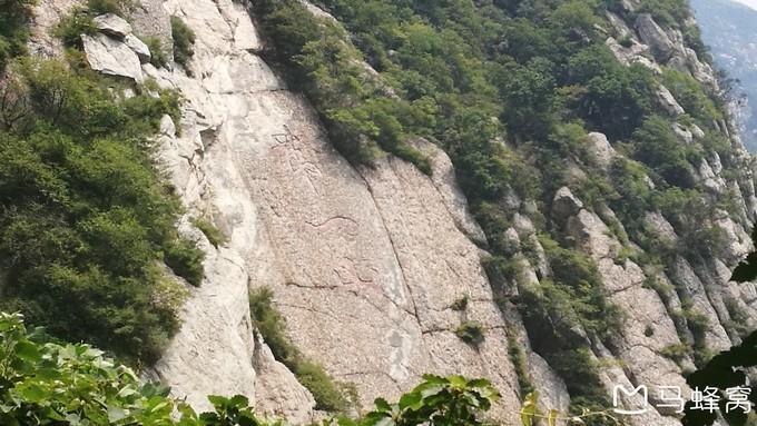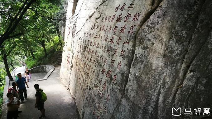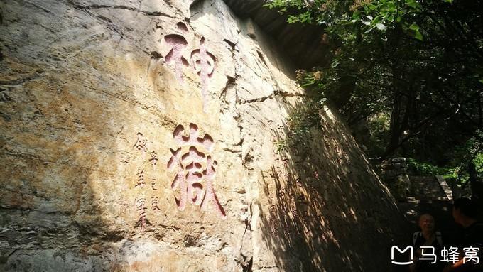 12:10,到达嵩阳运动地质遗迹。往前走不多时,看见山体刻有“神岳”二字,旁边刻着李白的《赠 嵩山焦炼师》:二室凌青天,三花含紫烟。中有蓬海客,宛疑麻姑仙。道在喧莫染,迹高想已绵。时餐金鹅蕊,屡读青苔篇。八极 恣游憩,九垓长周旋。下瓢酌颖水,舞鹤来 伊川 。还归空山上,独拂秋霞眠。萝月挂朝镜,松风鸣夜弦。潜光隐嵩岳,炼魄栖云幄。霓裳何飘飘,风吹转绵邈。愿同西王母,下顾东方朔。紫书倘可传,铭骨誓相学。传说李白当年到 嵩山 访仙问道不得,写下了这首诗,看来李白当时也有修道成仙的想法。