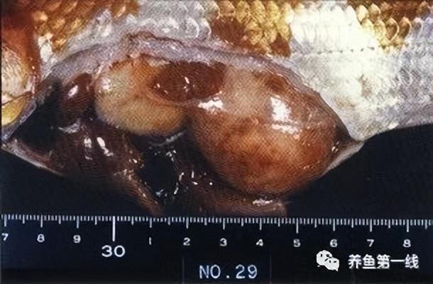 初期在腹部的局部有些膨胀,体态异常。随着病情发展,在腹部膨胀部位鱼鳞上积存有水样物,表现竖鳞症状,全身的鳞片立起的“松果症状”。再进一步发展肿瘤变大,呈背肌萎缩症状。像“舟蛾”一样呈反过来的体形。同时表现为眼球突出,色彩减退(照片1)。肿瘤直径从3~20厘米以上(照片2)不等。除重症者外,患鱼未见食欲下降。