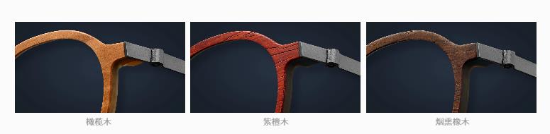 前框分别选用三种优质木材打造:橄榄木、紫檀木与烟熏橡木,每种木材呈现不同的天然木质纹路。配以手工打磨的水牛角, 诠释优质镜架的时尚风格。