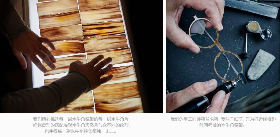 优质的天然水牛角材质不仅适合所有肤色, 还兼具亲肤性。水牛角系列镜架前框由天然水牛角板压制而成,这种层压工艺在提升水牛角强度和稳定性之余, 还消除了材料内在的压力。