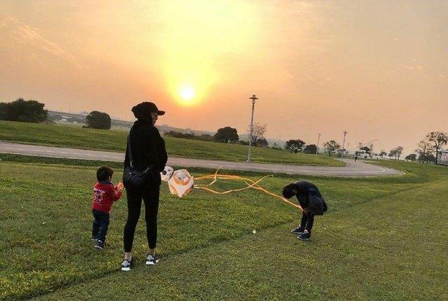 夕阳西下,老婆陈若仪和三个孩子一起放风筝的画面感觉非常温馨。