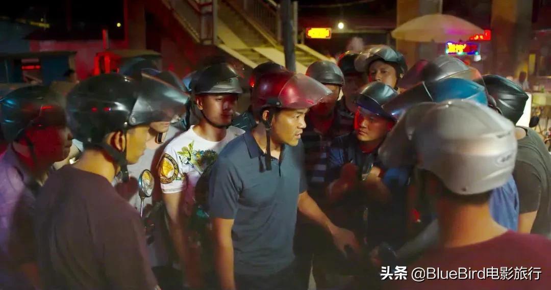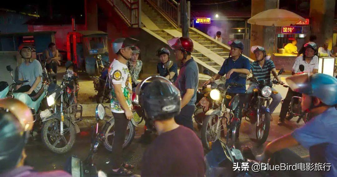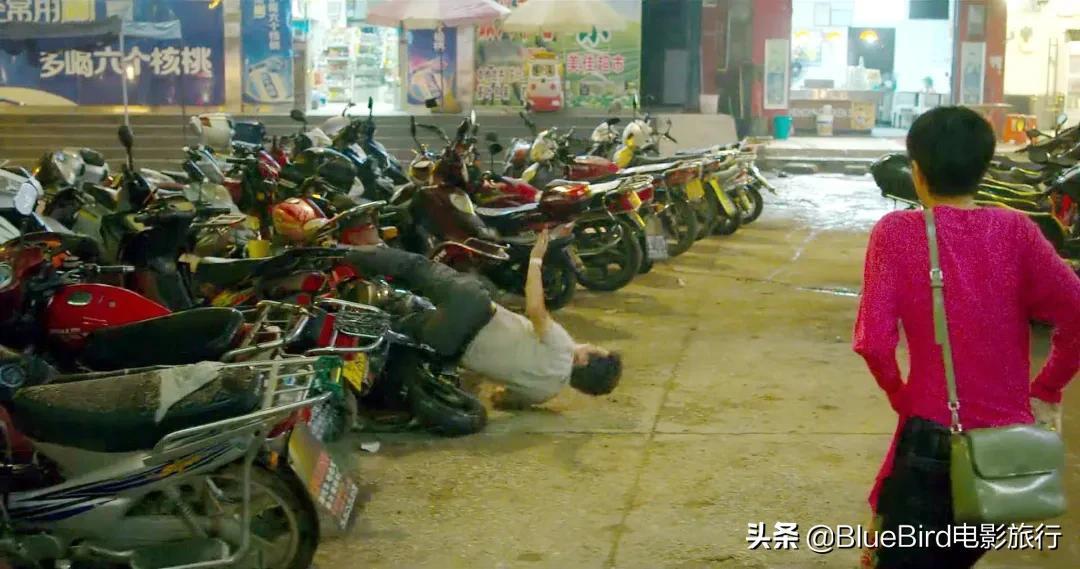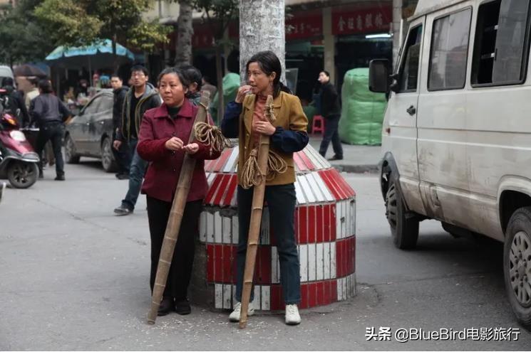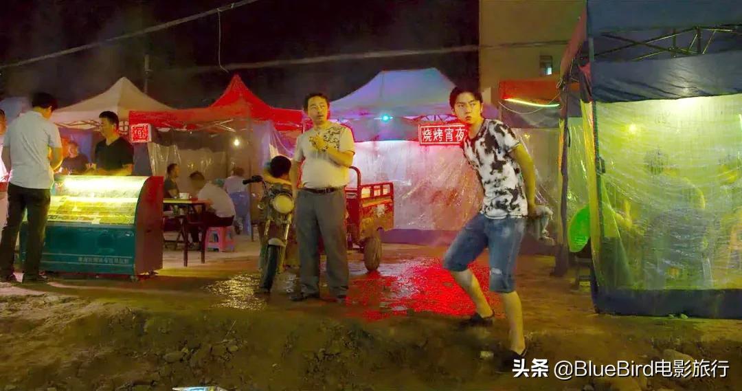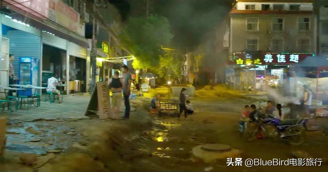 影片最宏大的一场戏——馄饨摊接头,发生在人流密集的城镇广场,广场边店铺林立,地摊丛生,生意兴隆,广场中央还有一群人在跳广场舞。后来警察突袭馄饨摊,广场上一片混乱,都是群演众多,场面调度难度高的大戏。