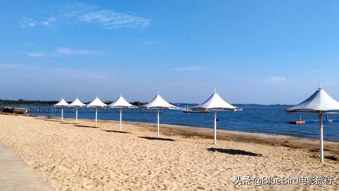 野鹅湖的沙滩,还要再往南,位于武汉和鄂州交界的梁子湖。梁子湖水域广大,湖岸曲折复杂又荒野,从沙滩所在的龙湾度假村望向水面,真的是一座楼房都看不见。