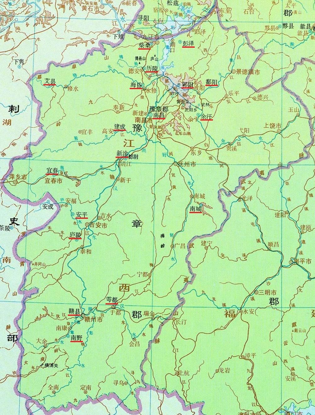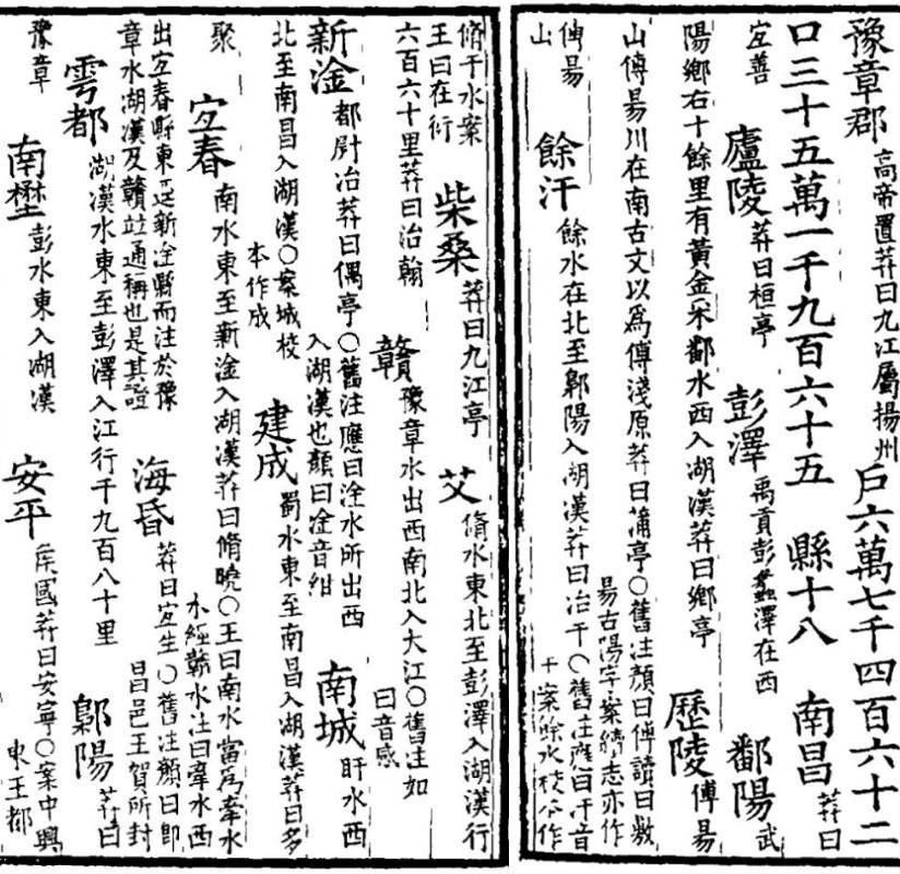 南昌,莽曰宜善。庐陵,莽曰桓亭。彭泽,《禹贡》彭蠡泽在西。鄱阳,武阳乡右十余里有黄金采。鄱水西入湖汉。莽曰乡亭。历陵,傅易山、傅易川在南,古文以为傅浅原。莽曰蒲亭。馀汗,馀水在北,至鄡阳入湖汉。莽曰治干。柴桑,莽曰九江亭。艾,修水东北至彭泽入湖汉,行六百六十里。莽曰治翰。赣,豫章水出西南,北入大江。新淦,都尉治。莽曰偶亭。南城,盱水西北至南昌入湖汉。建成,蜀水东至南昌入湖汉。莽曰多聚。宜春,南水东至新淦入湖汉。莽曰修晓。海昏,莽曰宜生。雩都,湖汉水东至彭泽入江,行千九百八十里。鄡阳,莽曰预章。南野,彭水东入湖汉。安平。侯国。莽曰安宁。