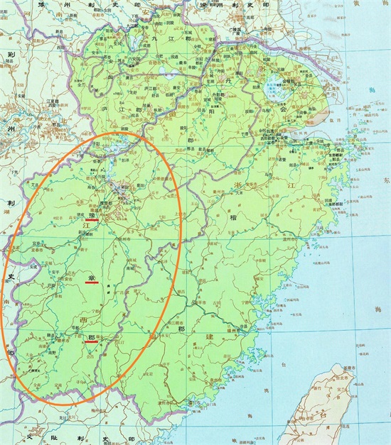 由图可见,汉代豫章郡之地,包括今江西省全省的范围,地域非常辽阔。该郡是一个相对独立的地理单元,是联通中原和东南、两湖、岭南各地的枢纽。在秦汉中央政权对闽越、南越等藩属国用兵时,该郡发挥着战略通道的作用。