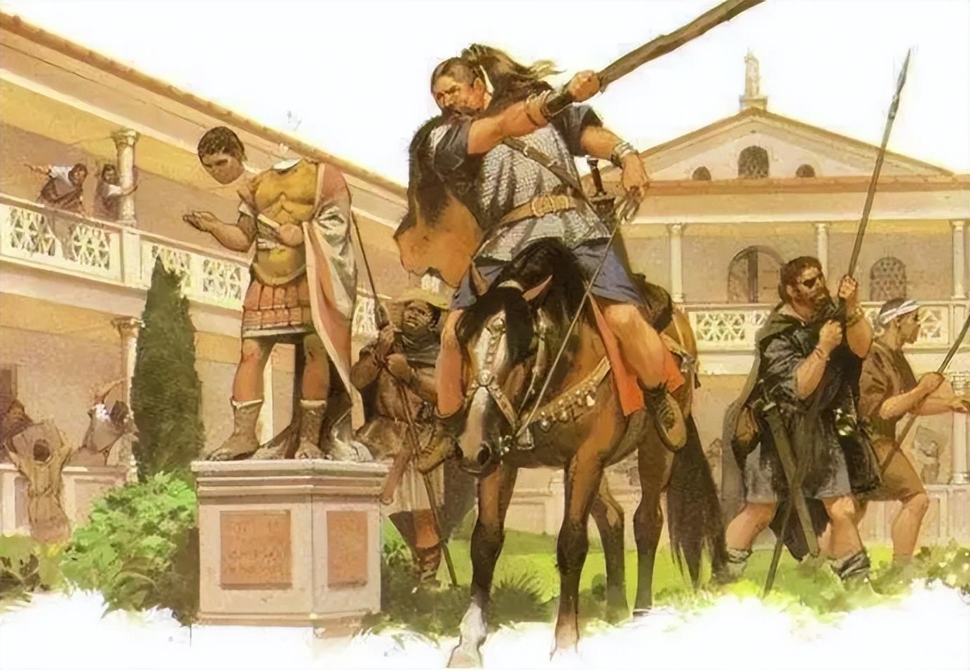公元前390年,高卢人与罗马人发生激战,罗马人战败,高卢人攻入了罗马城,洗劫了大量财物,这是罗马城第一次被蛮族人攻占。