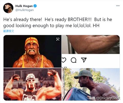 不过,这张照片看在Hulk Hogan的眼里,可没有嘴下留情的,他在推特笑说:「虽然Chris Hemsworth的肌肉准备好了,但他的长相够帅到可以扮演我吗?哈哈哈!」