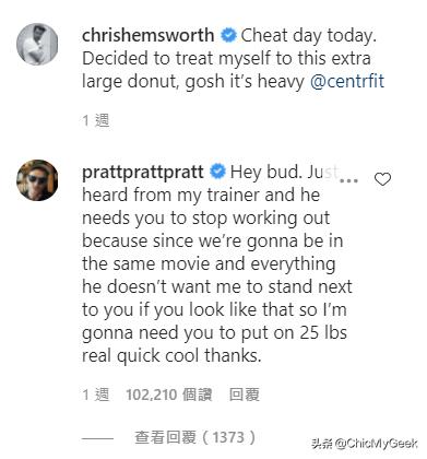 另一边,“星爵”Chris Pratt也很看不下去,他眼见Chris Hemsworth不停练肌肉,感到极大的压力,很担心届时跟他一起演出《雷神4》时,会当场被他比下去,于是留言道:「喂,老兄,刚刚我的教练要我跟你说别再操了,因为你要是再继续练下去,他就不准我跟你在同部戏里站在一起,所以可以麻烦你增肥25磅吗?大感谢!」