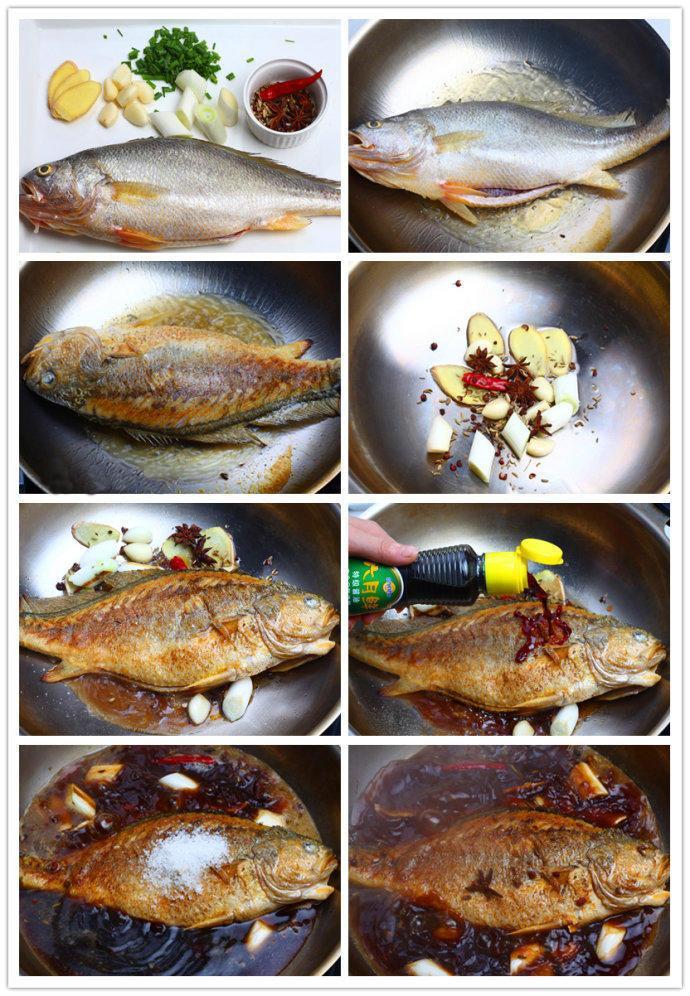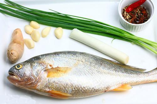 黄菇鱼、盐、糖、绍酒、酱油、醋、胡椒粉、姜、大蒜、葱、香葱、花椒、大料、小茴香、干辣椒。