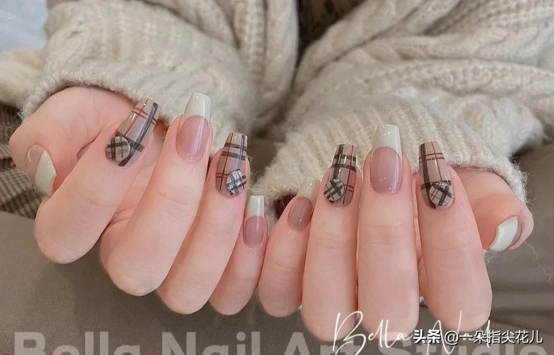 第三款:经典弧形法式边+巴宝莉格子彩绘+饰品。非常高级!