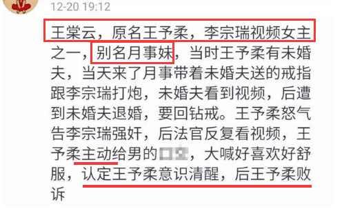 首先从月事妹这个名称由来说起,月事妹,李宗瑞性爱偷拍影片其中一名影片女主角,因生理期戴着未婚夫送的大钻戒偷情李宗瑞,被人称为“月事妹”,真名王予柔。这一段描述是百科对月事妹称呼的解释。很多好奇的网友就问了,这个王予柔和王棠云又不是一个人,怎么就侮辱人家是月事妹?