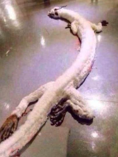 这是日本渔民捕获的一条龙,遗体已经开始腐烂了,跟我们理解的中国龙还是有差距的,更像是长颈龙。