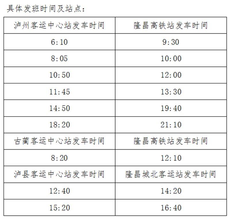 目前,泸州客运中心站、古蔺县客运中心站、泸县客运中心站均已开通到隆昌高铁站的直达班车。